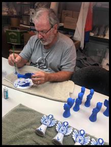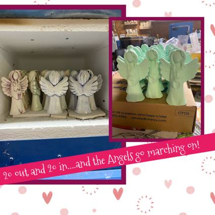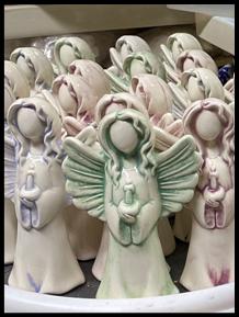 The process entails creating ceramic Angels and then distributing them to healthcare workers. In fact, we are now going beyond that initial group to include First Responders as well as Essential Workers. In most cases they are being created from the ground up. Clay slip is cast into an Angel mold, removed then goes through a cleaning process to the kiln for its first firing. After it has been fired in this first bisque stage, the Angel is painted. Then glaze is applied and kiln fired again to complete the process.